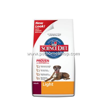 สูตร Light Adult สำหรับ สุนัขอายุ 1- 6 ปี ที่อ้วนง่าย มีกิจกรรมน้อยหรือสุนัขที่ทำหมันแล้วซึ่งมีโอกาสอ้วนได้ง่าย สามารถช่วยควบคุมน้ำหนักตัวได้อย่างมีประสิทธิภาพโดยการลดปริมาณ ไขมันและพลังงานลงในขณะที่ปริมาณอาหารเท่าเดิม อุดมด้วย คาร์นิทีน ช่วยในการเปลี่ยนแปลงไขมันไปเป็นพลังงาน และช่วยเสริมสร้างกล้ามเนื้อ มีเส้นใยอาหารจากธรรมชาติปริมาณสูง ช่วยให้สุนัขรู้สึกอิ่ม ไม่เครียดและสามารถควบคุมน้ำหนักตัวของสุนัขให้เหมาะสม รสชาติดี ที่สุนัขของคุณชื่นชอบ
